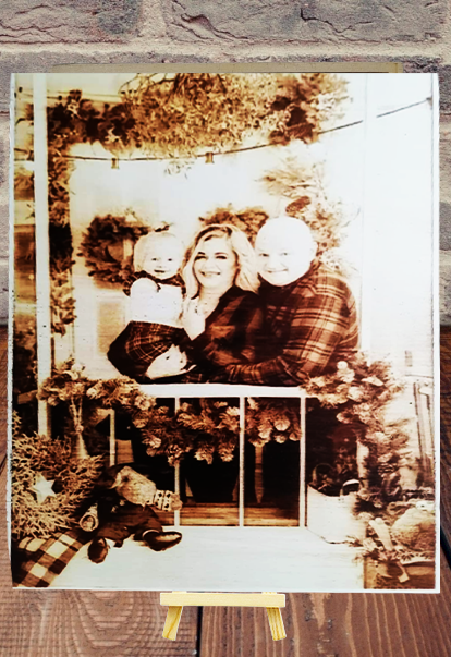 De porteret zelf meet 29,2 cm x 41,5 cm. Stuur ons je foto en we zullen een pyrograaf gebruiken om het op hout te branden.