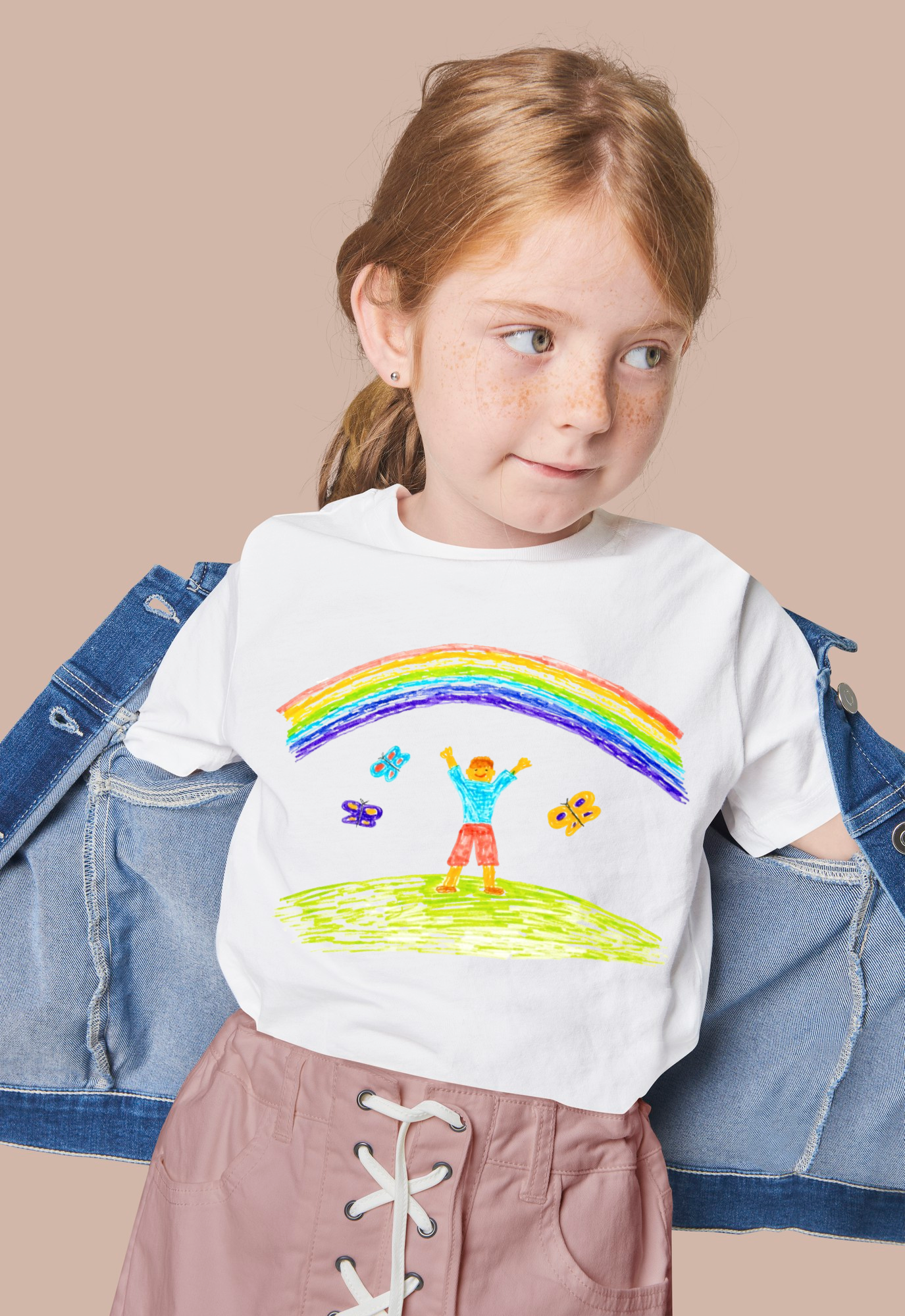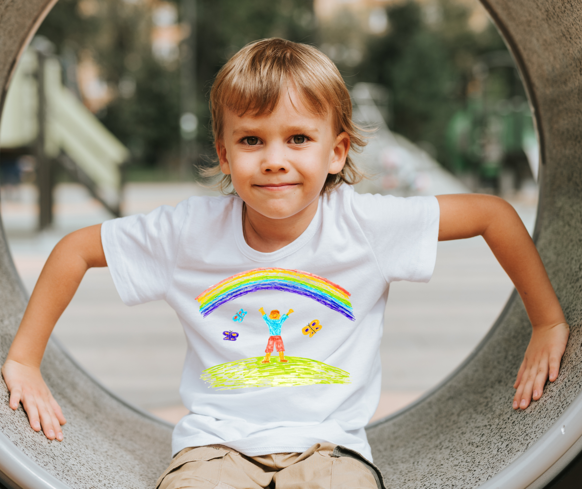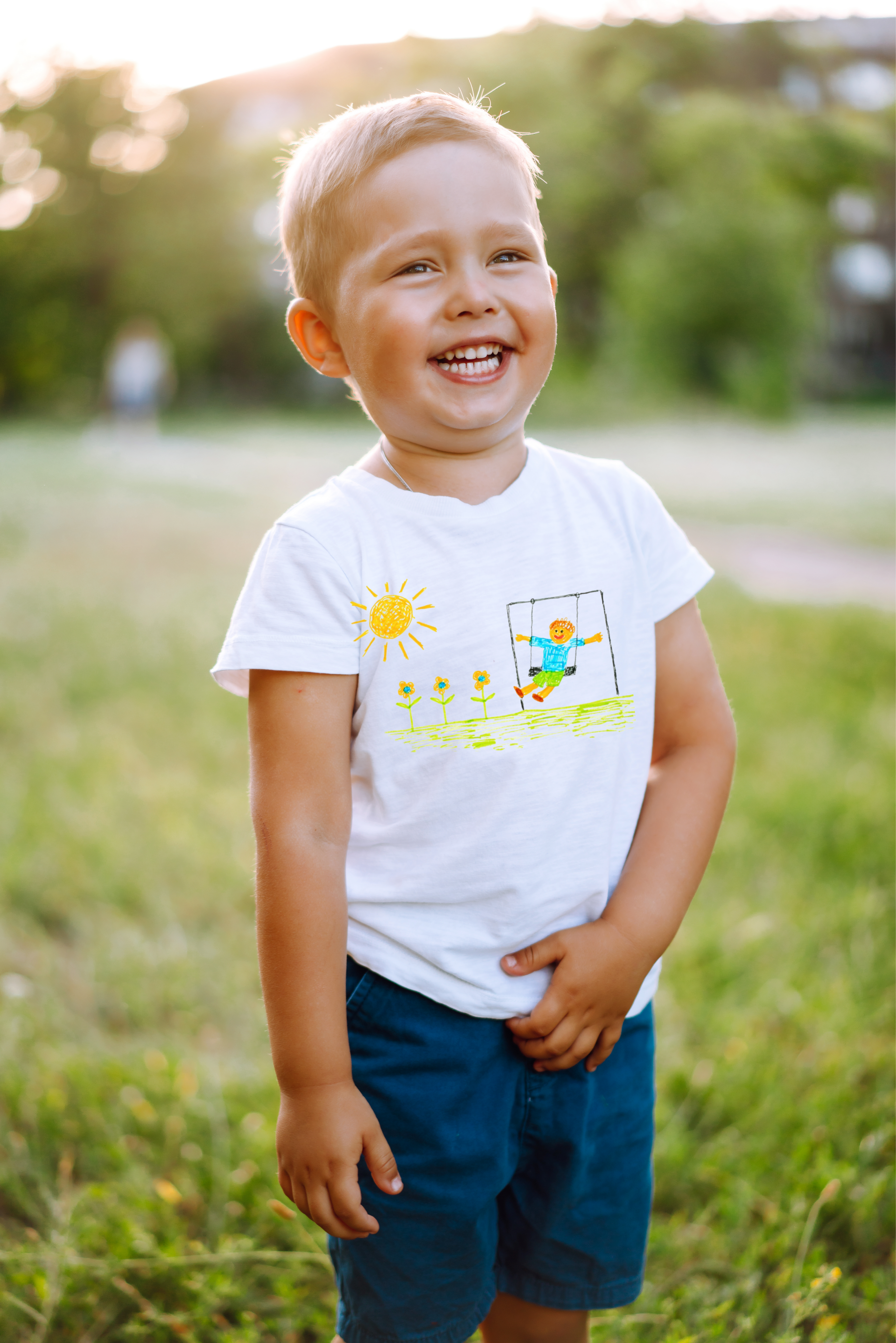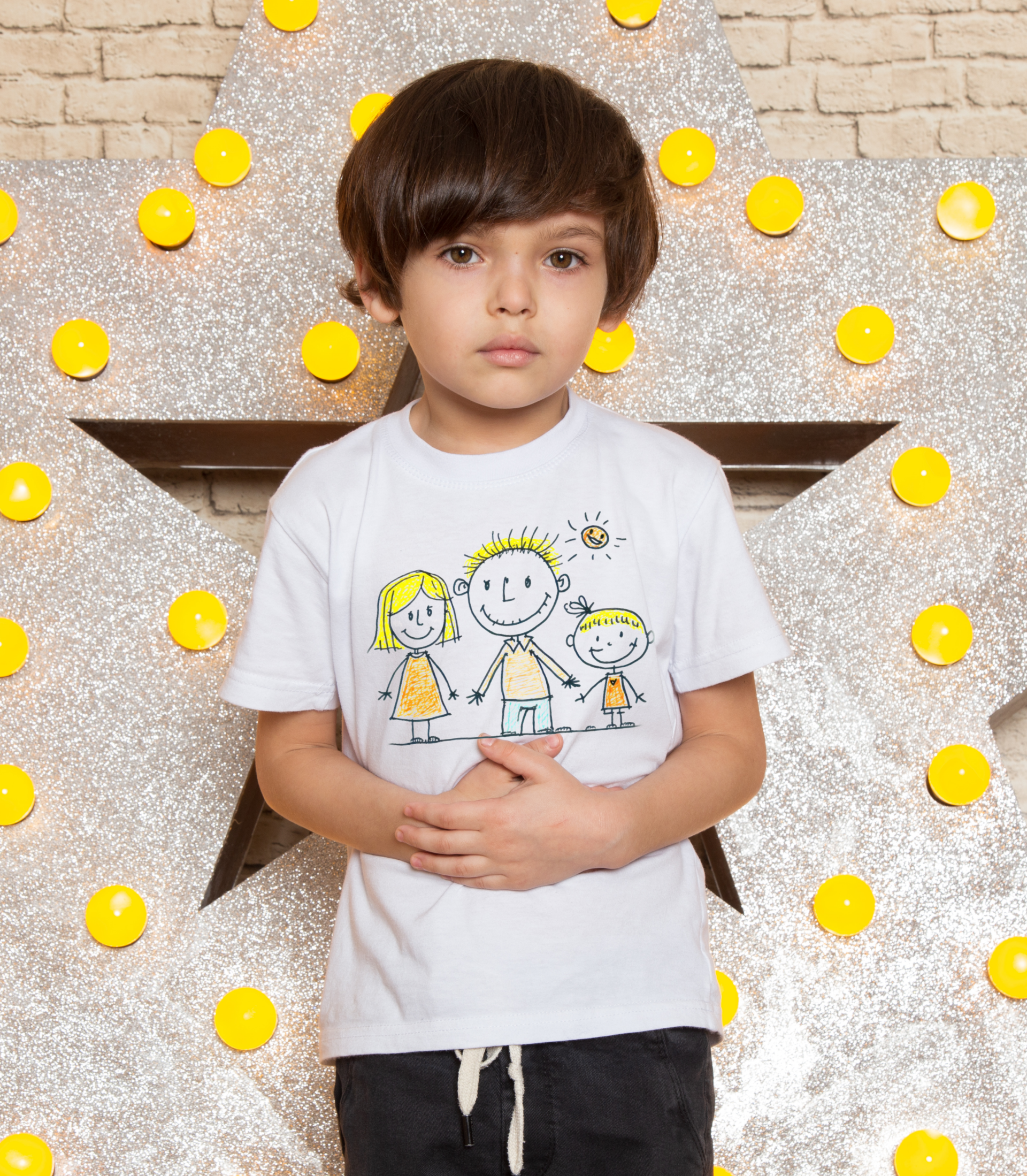 Stuur ons gewoon een foto van de foto of tekening van uw kind, dan printen wij deze op een blouse voor uw kind